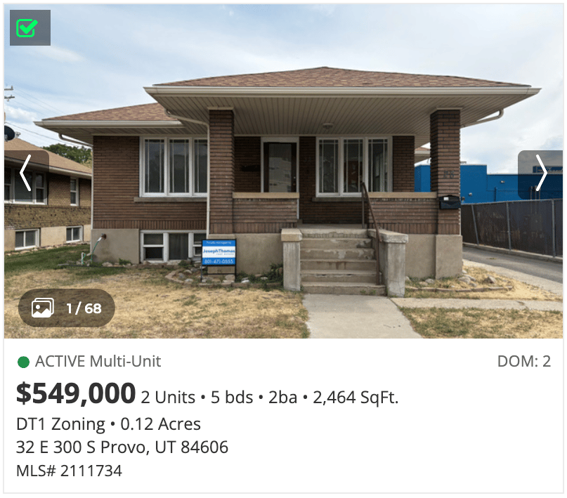 Legal Duplex in the Heart of Provo – DT1 Zoning – Location doesn't get better than this! This legal duplex is just 1 block south of the Provo City Center Temple and 3 blocks from Downtown Provo's shopping, dining, and entertainment, this duplex offers unmatched convenience. Enjoy excellent access to transit-only 1 block from the UVX bus stop (direct to BYU, UVU, and the entire Provo/Orem area), 3 blocks from the FrontRunner station, 3 minutes from I-15, and just 1 mile south of BYU campus. Parking lot in rear provides ample off-street parking.