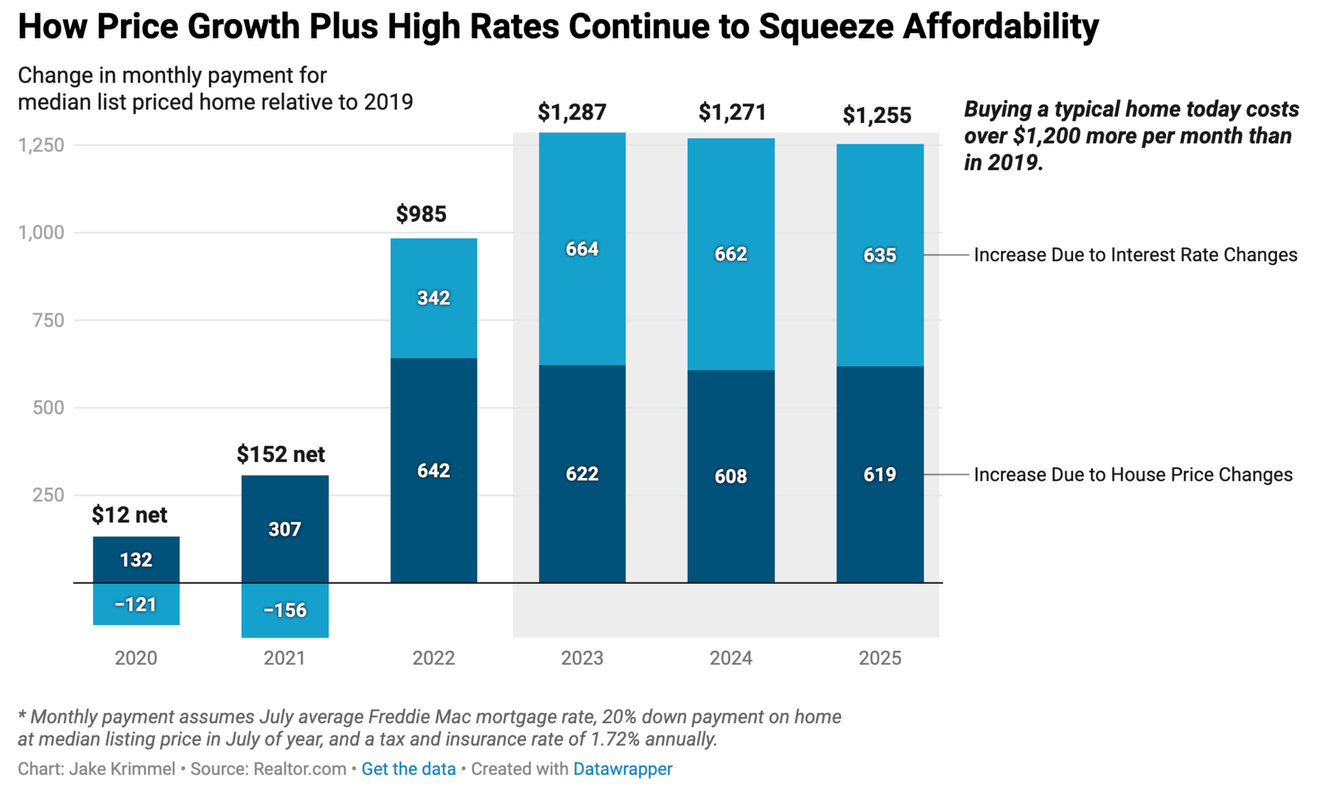 Buyers face the “double whammy” of high home prices and high mortgage rates, adding over $1,200 a month compared to 2019.