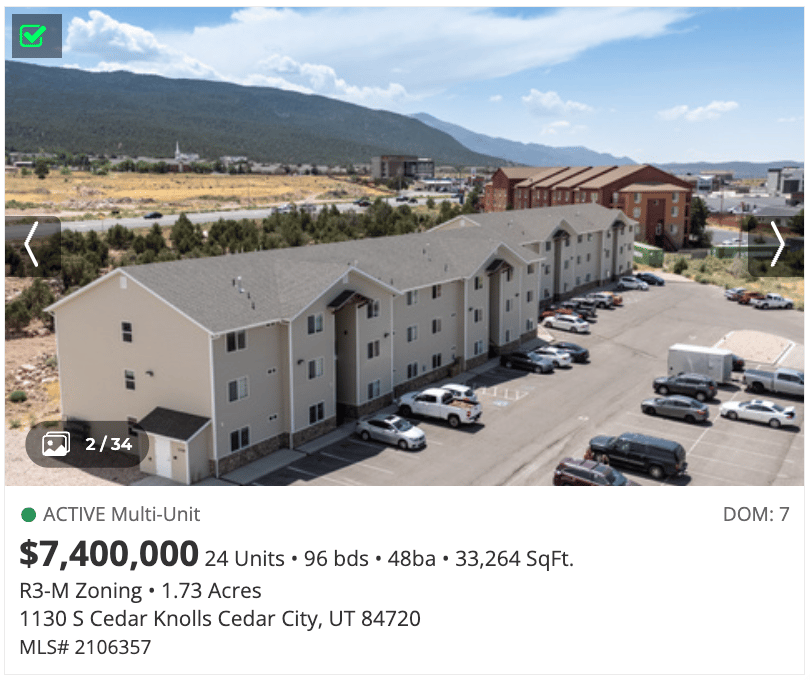 Rare opportunity for an established 24 unit student apartment building in the middle of Cedar City! The property consists of two 12 plex apartment buildings that are each 3 stories tall, making up 96 bedrooms in total. Each apartment unit floor plan consists of 4 bed 2.5 bath with it's own kitchen, living room/dining area & laundry. Newly built in 2018, the apartment building and units are in great shape. As a student rental, the building has been receiving around $550 per month per private bedroom. The landlord is currently paying all of the utilities. Plenty of parking with 125 parking stalls. With being around 1 mile from the SUU campus, this building is ideal to be used as a student housing complex. SUU is projected to continue to grow.