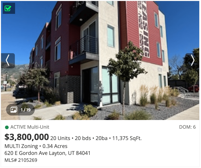 SELLER FINANCE AVAILABLE: Newer 20 plex in great Layton location. All units are Studio apartments with full size appliances including dishwasher and stackable washer/dryer. Gross rents are $20,345. Other income is 5500 and total operating expenses including property management fee is 7000. Net income after all expenses is roughly $18,800 per month. Seller willing to offer seller financing for 1 year at 4% interest with 25% downpayment.