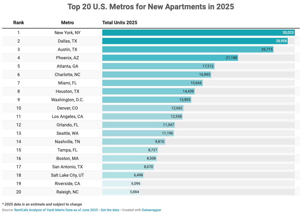 The U.S. is on track to add over 500,000 new apartment units this year, led by major construction in the South and key cities like New York, Dallas, and Austin. While down from 2024’s record pace, this year’s supply is still well above normal.